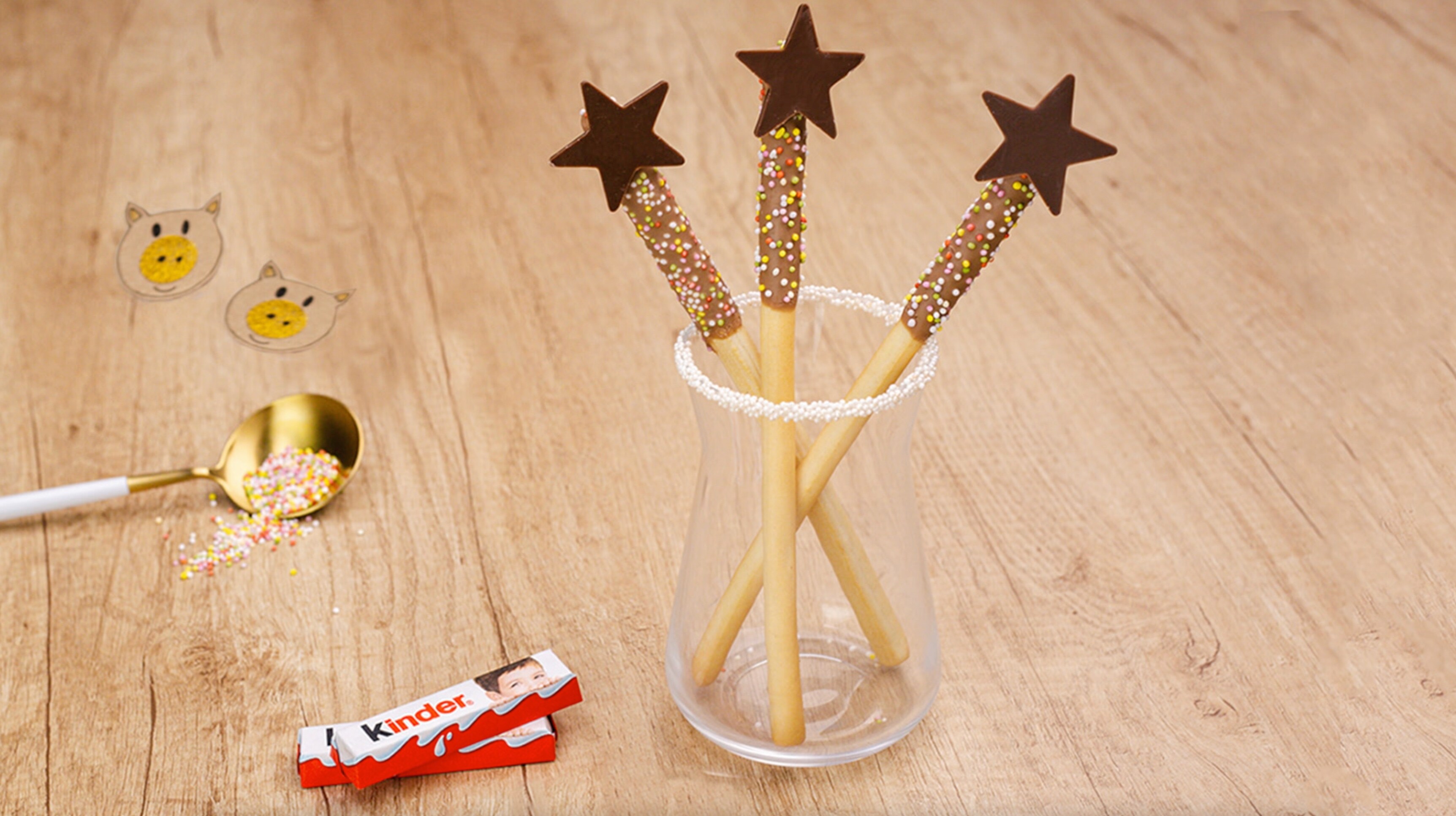 Dunk one third of the bread stick in the melted Kinder Chocolate. Next, sprinkle with the hundreds & thousands, covering all sides.