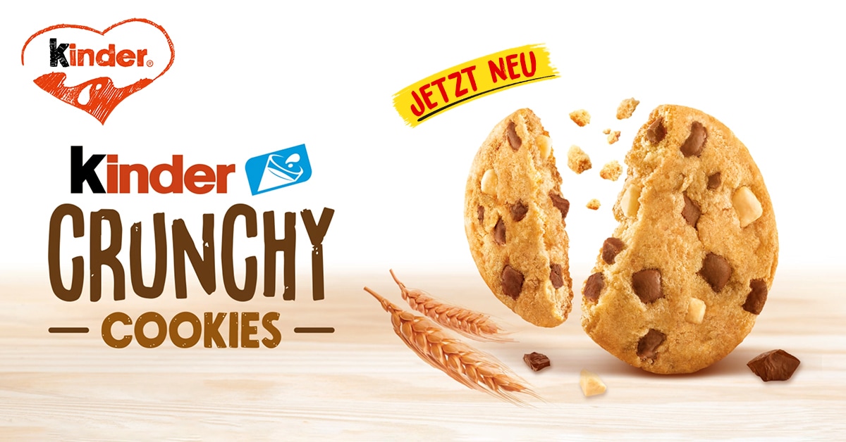 kinder Crunchy Cookies – die neue Kombination aus knusprigem Keks und feinen Stückchen mit Milch und Kakao mit dem unverwechselbaren Geschmack von kinder. Um dem Moment ein Knuspern zu verleihen!