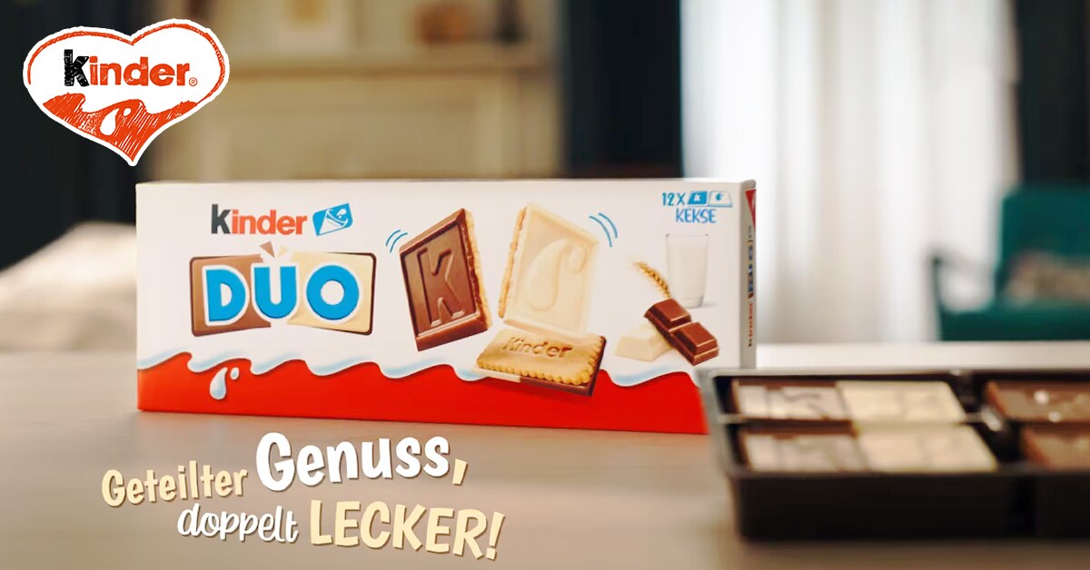 kinder DUO ist die Kombination eines Schokoladentäfelchens aus Vollmilch- und Weißer Schokolade mit einem leckeren Keks, der ganz nach dem persönlichen Geschmack verzehrt werden kann. Einfach mit der Lieblingsseite beginnen und genießen! In einer praktischen Verpackung eignet sich kinder DUO gut zum Teilen mit der Familie, Freunden oder Kollegen – denn geteilter Genuss ist doppelt lecker!