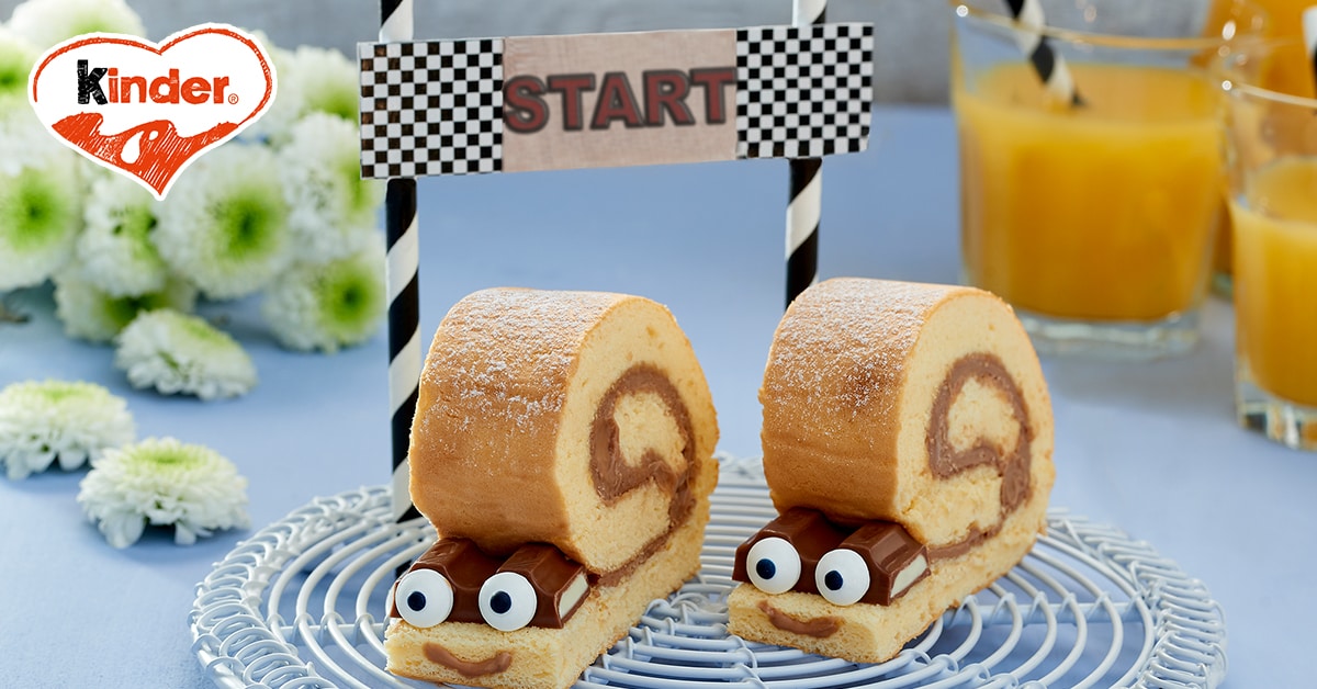 Übrige geschmolzene kinder Schokolade® zügig mit Quark und Zucker verrühren und auf dem Biskuitboden verteilen. Biskuitboden von der kurzen Seite her aufrollen und ca. 2 cm Rand nicht mit aufrollen. Rolle ca. 30 Minuten kaltstellen und in 12 Schnecken schneiden. Beiseite gestellte Segmente kinder Schokolade® auf die überstehenden Enden der Schnecken legen und mit Hilfe der beiseite gestellten geschmolzenen kinder Schokolade® mit Zuckeraugen sowie nach Wunsch mit Mund aus Zuckerschrift garnieren.