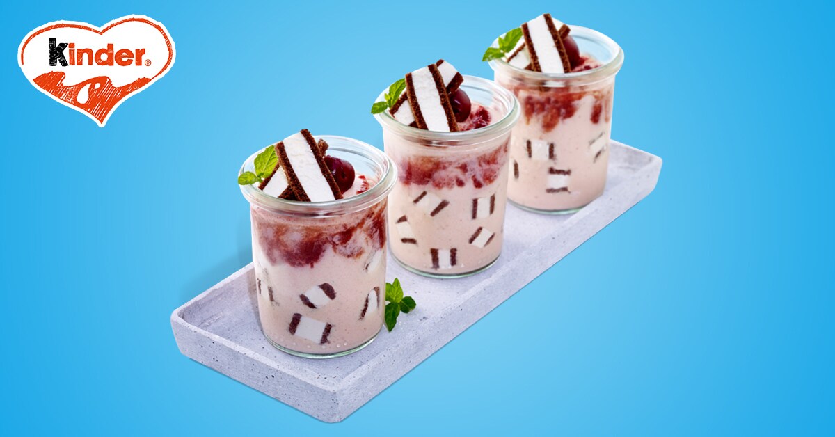 Ein Frucht-Dessert der besonders leckeren Art. Gekühlte Milch-Schnitte® in lockerer Mousse-Creme getoppt mit Kirsch-Kompott – ein toller Nachtisch für die ganze Familie.
