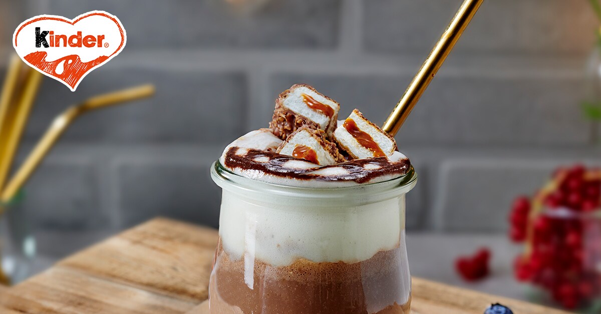 Milch-Shake in gekühlte Gläser füllen, mit Milchschaum toppen, mit Schokoladensauce und Würfeln aus kinder Maxi King garnieren und servieren.