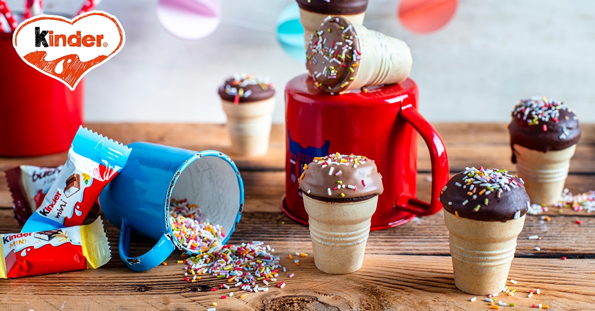 Waffelbecher bis zur Hälfte mit Teig befüllen und jeweils ein Produkt aus dem kinder Happy Moments Mini Mix® in den Teig stecken. Anschließend Waffelbecher bis ¾ unter dem Rand mit restlichem Teig auffüllen und auf der mittleren Schiene 15-20 Minuten backen. Danach vollständig auskühlen lassen.