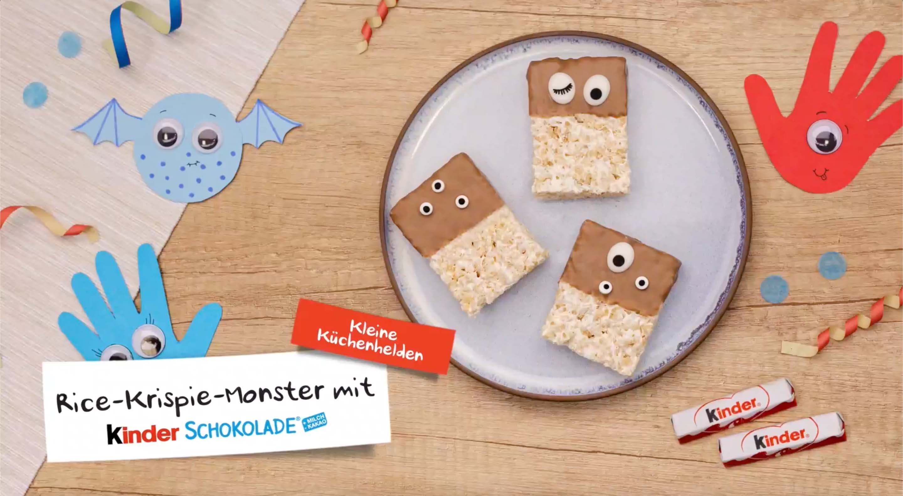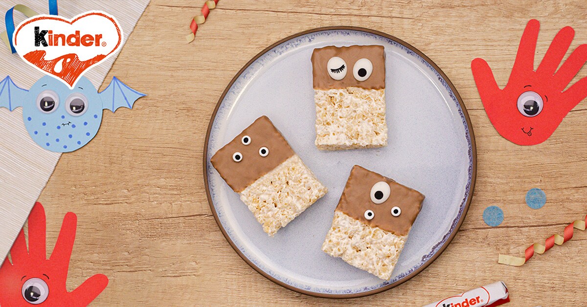 Die kinder Schokolade im Wasserbad schmelzen. Das obere Ende jedes Puffreis-Stücks in die geschmolzene kinder Schokolade tauchen. 2-3 Zucker-Augen platzieren.
