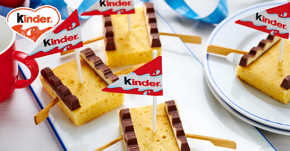 Unterseite der halbierten Riegel mit geschmolzener kinder Schokolade® bestreichen, als Reling von oben an die langen Seiten der Kuchenstücke legen und trocknen lassen. Beiseitegelegte Papiere als Segel um die Cake-Pop-Stiele falten und in die Kuchenstücke stecken. Holzspieße als Ruder in die Seiten der Boote stecken und Segelboote mit kinder Schokolade® servieren.