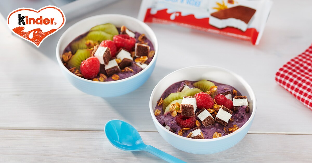 Milch-Schnitte® in kleine Würfel schneiden. Blaubeeren auftauen lassen und mit Banane und Quark fein pürieren. 2/3 der Würfel aus Milch-Schnitte® und 30 g Granola vorsichtig unter die Smoothie-Basis heben und in kleine Bowls (Ø ca. 10 cm) füllen.