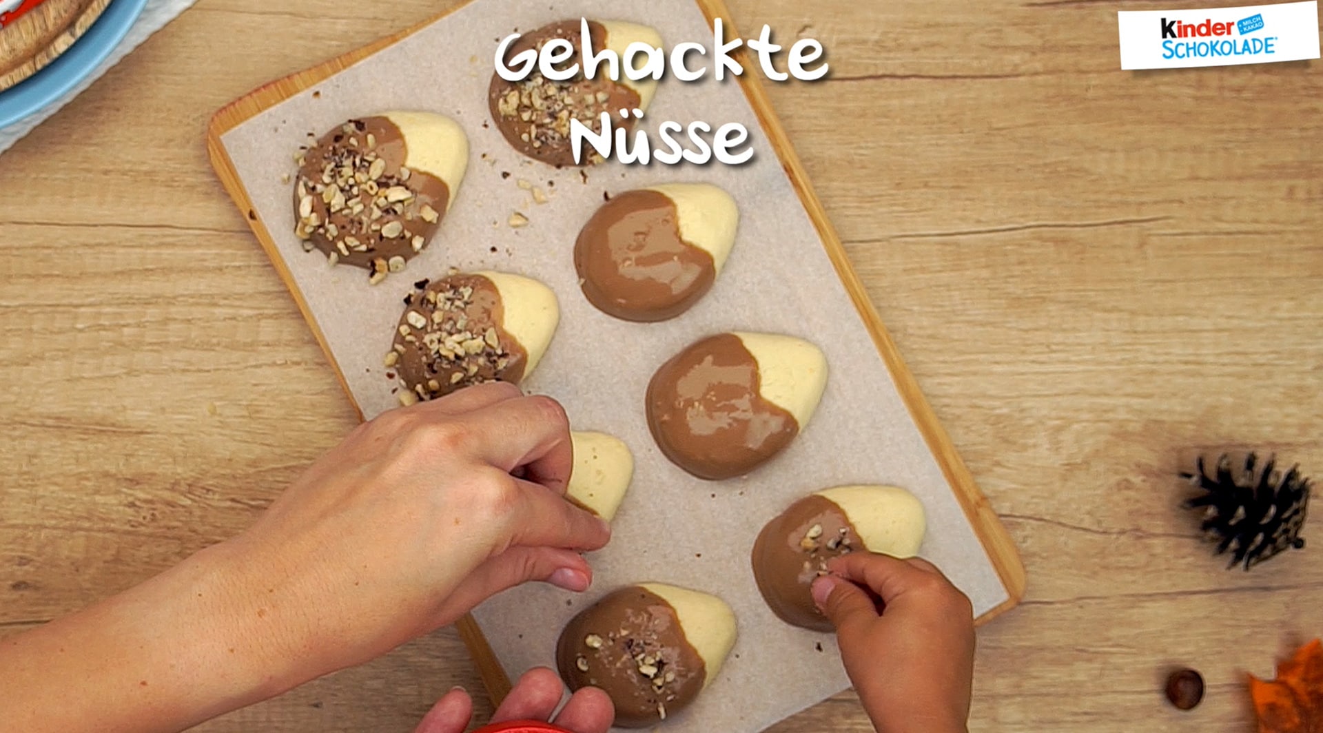 kinder Schokolade® im Wasserbad erhitzen und umrühren, bis sie komplett geschmolzen ist. Etwas abkühlen lassen. Die runde Seite der Igel-Kekse in die Schokolade tunken. Mit gehackten Nüssen bestreuen und auf ein Backpapier legen. Zahnstocher in die Schokolade tunken und Punkte als Augen und Nase auf die Igel malen. Die Schokolade trocknen lassen.