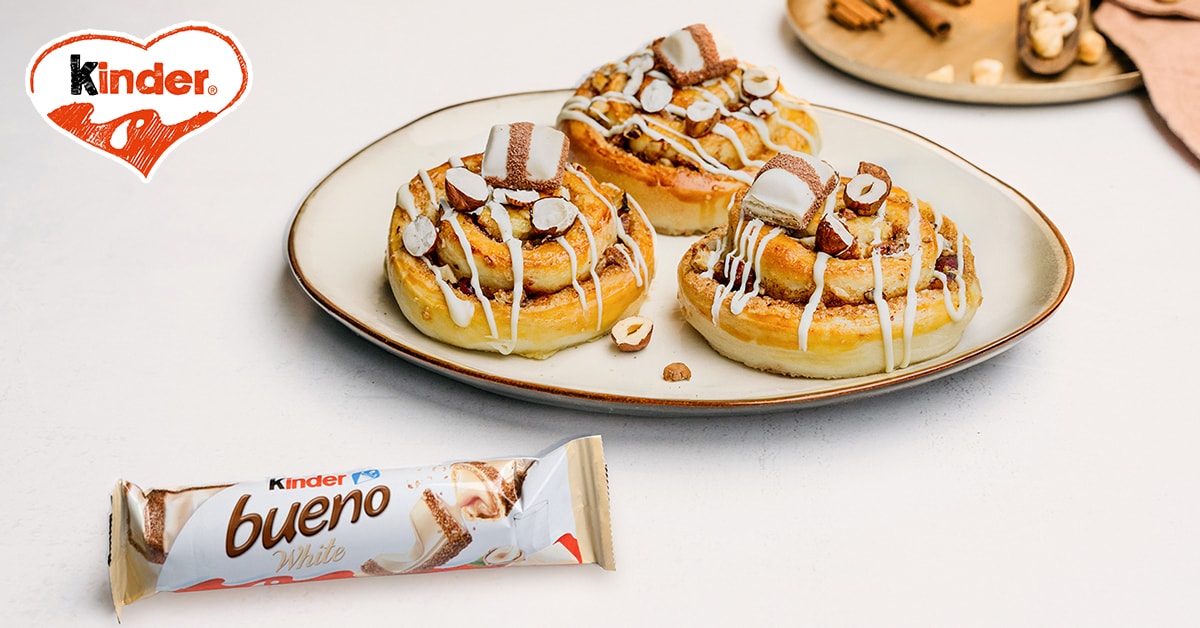 - Schnecken mit geschmolzener Schokolade beträufeln und mit kinder bueno White Stücken und den restlichen gehackten Haselnüssen verzieren.