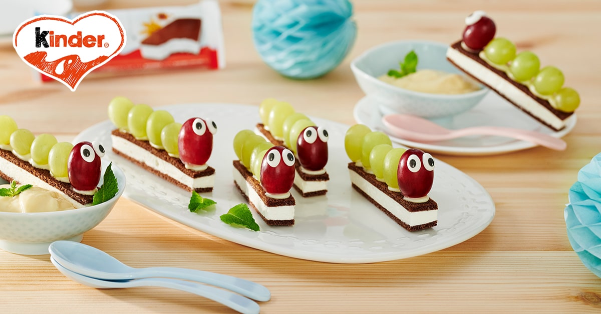 Zuckeraugen mit Hilfe beiseitegestellter geschmolzener Schokolade auf die großen blauen Trauben kleben. Pudding glattrühren, Joghurt unterrühren und Zitronencreme in kleine Schalen füllen. Zitronencreme mit Milch-Schnitte® Raupen und frischer Minze garnieren und servieren.
