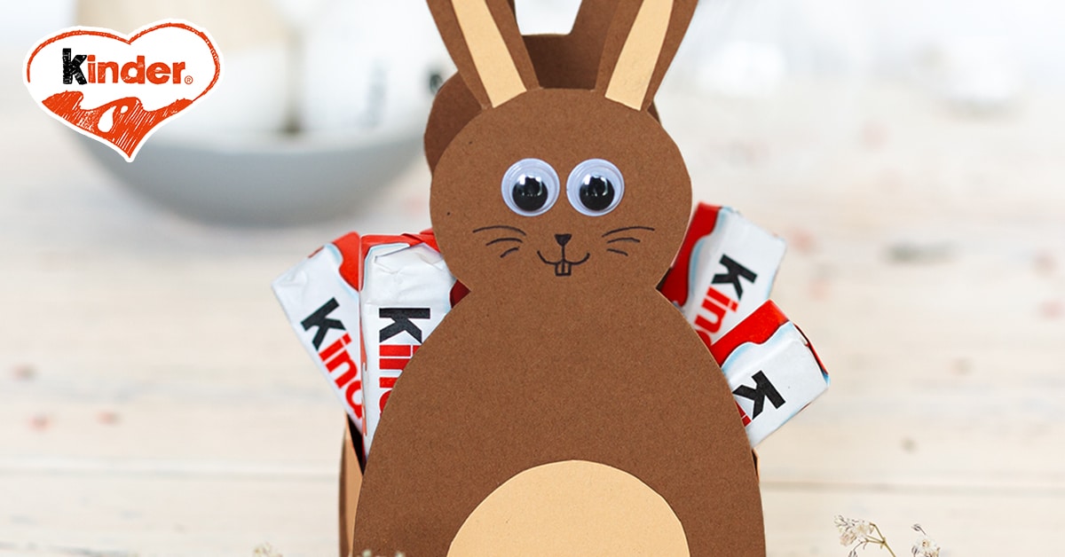 Klebe nun beide Hasen von vorne und hinten an die Schachtel. Befülle das Osternest mit kinder Schokolade – fertig!
