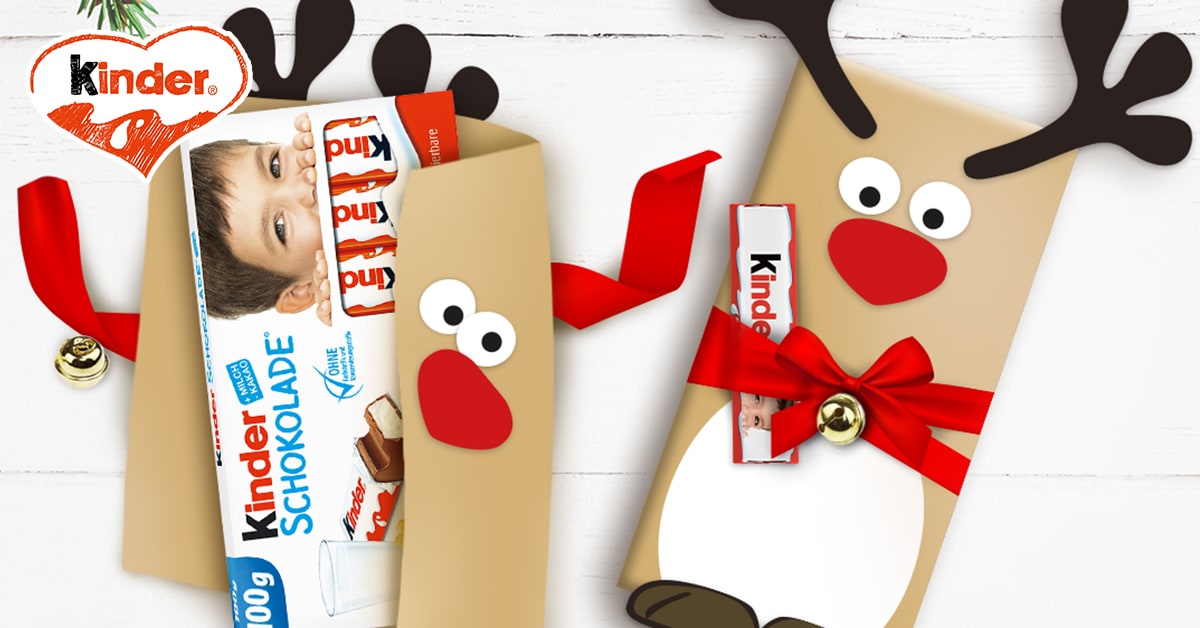 Packe erst die Packung kinder Schokolade in das braune Packpaper ein.