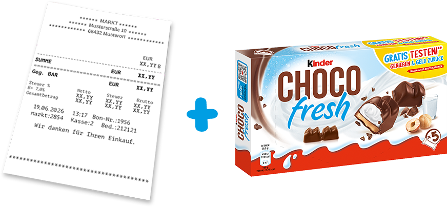 Auf dem Kassenbon müssen folgende Daten gut erkennbar sein: Die Einkaufsstätte, der Kaufpreis des Aktionsproduktes, der Gesamtbetrag des Kassenbons, das Einkaufsdatum und die Uhrzeit. Zusätzlich muss die gesamte 5er Aktionspackung kinder Chocofresh auf dem Foto zu sehen sein.