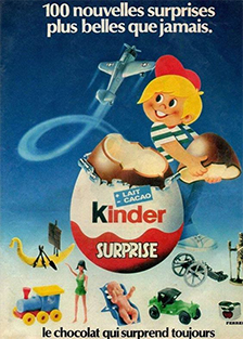 Kinderi mänguasjad pakuvad meelelahutust mitte ainult lastele, vaid ka täiskasvanutele - lõppude lõpuks põhineb selle võlu emotsioonidel ja uudishimul, mida see äratab. 1974. aastal leiutatud Kinder Surprise pakub lastele aastaringselt rõõmu Itaalia lihavõttepühade traditsioonist. Täna teab ja armastab seda kogu maailm.