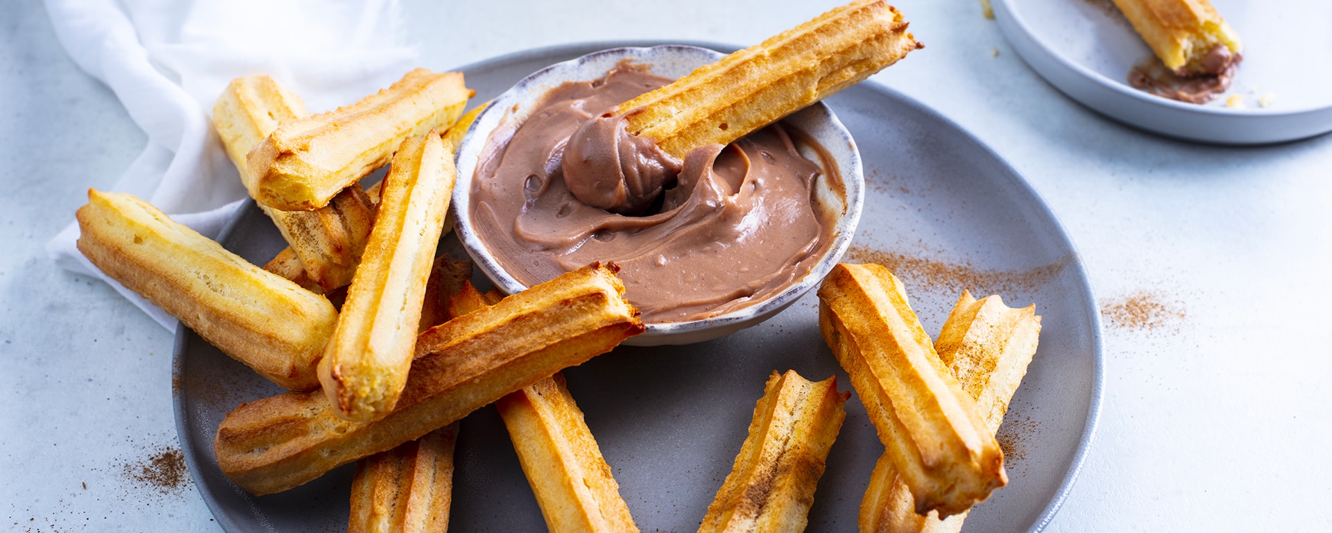 Préchauffer le four à 200 °C en mode traditionnel (chaleur de voûte et de sole). Pour préparer la pâte à churros : mettre le beurre, l’eau, le sucre et le sel dans une casserole sur feu vif et porter à ébullition. Ajouter ensuite toute la farine en une seule fois dans la casserole et mélanger le tout à la cuillère jusqu’à obtenir une pâte lisse. Sur feu moyen, remuer la pâte jusqu’à ce qu’une couche blanche se forme au fond de la casserole et que la pâte se détache des parois de la casserole.
