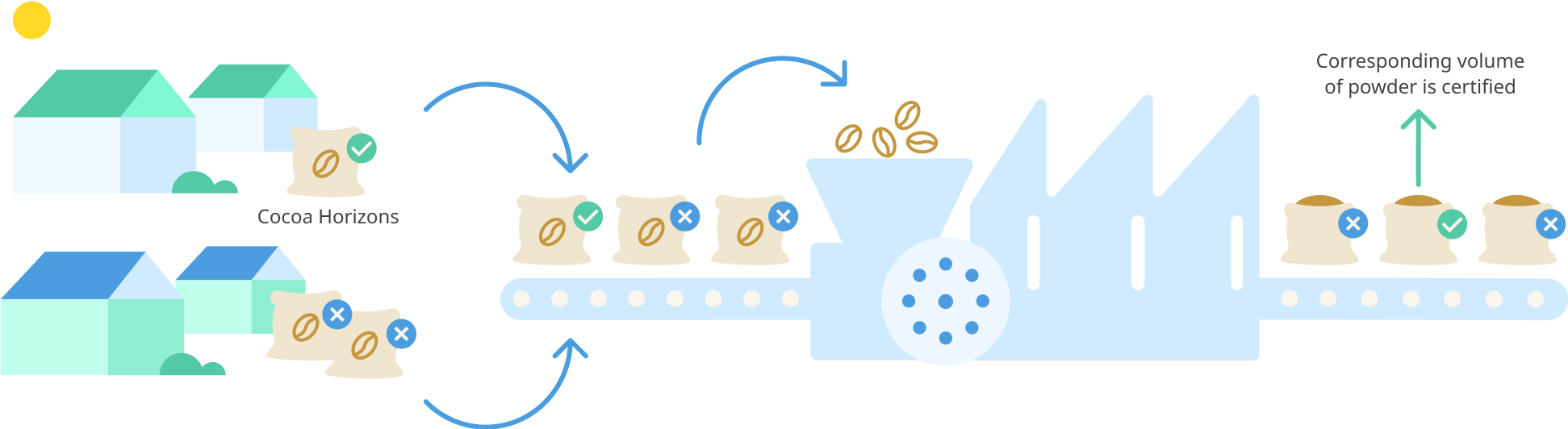 Το μεγαλύτερο μέρος του κακάο μας έρχεται ως ακατέργαστοι κόκκοι, τους οποίους επεξεργαζόμαστε στα εργοστάσιά μας και τους προμηθευόμαστε ως φυσικά ανιχνεύσιμους από τις φάρμες στο εργοστάσιό μας. Επειδή οι κόκκοι προέρχονται από διαφορετικές φάρμες, αυτό το κακάο είναι ένα μείγμα διαφορετικών προτύπων πιστοποίησης.