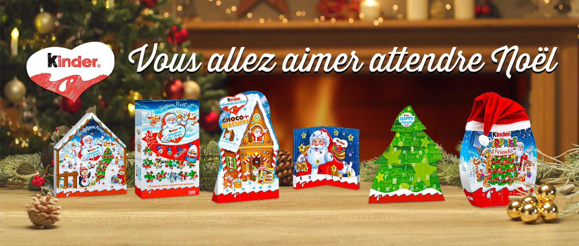 L'incontournable calendrier Kinder Chocolat Happy composé de 24 chocolats Kinder ! Chaque jour découvrez vos chocolats préférés sur le thème de Noël avec nos deux designs qui racontent chacun une histoire différente !