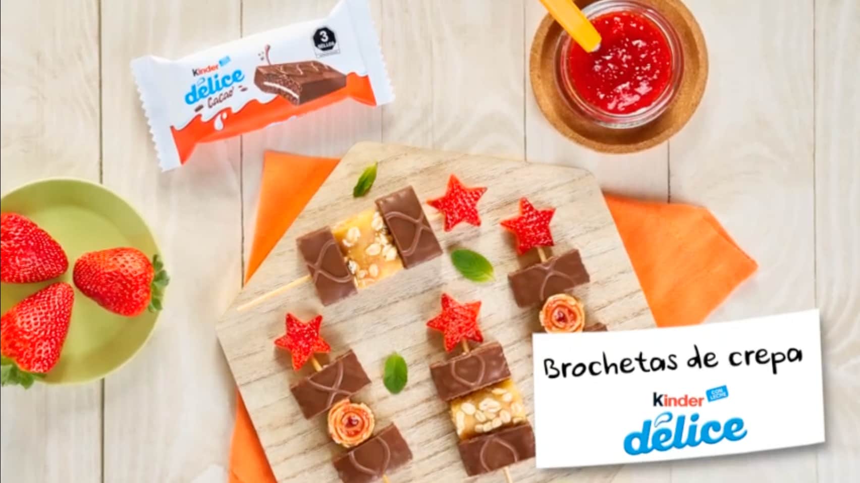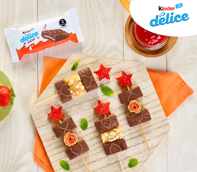 Brochetas de Crepa Kinder® Délice Las brochetas más divertidas las preparas con Kinder® Délice.Me gusta | 0Ya te gusta ;)20 minutoskch_receta_brochetas_de_crepa_con_kinder_delice.pdf Ingredientes 3 Kinder® Délice de 117 g2 crepas de 30 cm de diámetro (70 g)6 fresas chicas enteras (60 g)3 cucharadas de mermelada de fresa sin azúcar (60 g)6 palos de brochetaInformación nutricional Porciones: 6 porcionesPor ración: 140 gPor porción: 250 cal Instrucciones to be removed Cortar cada Kinder® Délice por la mitad y luego por la mitad. Cortar la crepa en tiras de 2-3 cm de ancho aproximadamente la crepa para obtener seis tiras. Untar cada tira con ½ cucharada de mermelada y enrollar. Cortar la fresa en forma de estrella. Insertar en cada palito un cuarto de Kinder® Délice, un rollito de crepa, otro cuarto de Kinder® Délice y una fresa en forma de estrella. Puedes ver nuestro tutorial completo aquí: Brochetas de Crepa Kinder® Délice Compartir receta Receta anteriorVolver a recetasReceta siguiente