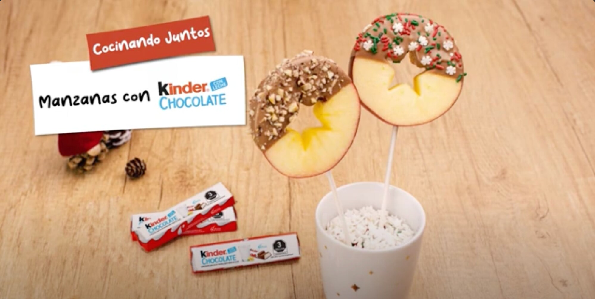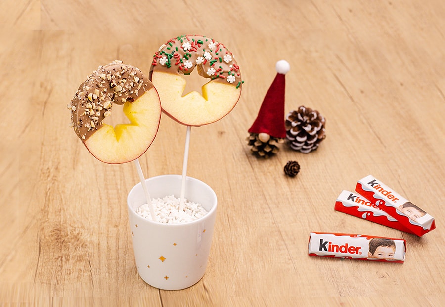 Manzanas con Kinder® Chocolate Manzanas con Kinder® Chocolate Me gusta | 0Ya te gusta ;)25 minutos10 minutoskinder_chocolate_receta_manzanas_con_kch.pdf Ingredientes: 2 manzanas2 cucharadas de jugo de limón10 barras de Kinder® Chocolate (125 g)30 g de chispas de colores30 g de trozos de nuezInformación nutricional: Porciones: 10Por porción: 63 gPor porción: 108 kcal Instrucciones: removed Lavar las manzanas. Cortarlas en rodajas de 0.5 a 1 cm de grosor. Utilice cortadores de galletas para quitar el corazón y las semillas de la manzana. Pincelamos las rodajas de manzana por ambos lados con un poco de jumo de limón para evitar que se doren. Séquelo con un paño de cocina limpio. Inserta palitos de madera en las rodajas de manzana. Derretir Kinder® Chocolate a baño maría. Sumerge la mitad superior de cada aro de manzana en Kinder® Chocolate. Decora con chispas de colores de azúcar o trozos de nueces. Colocar en el frigorífico durante 15 minutos. Puedes ver nuestro tutorial completo aquí: Manzanas Kinder Chocolate Compartir receta Receta anteriorVolver a recetasReceta siguiente