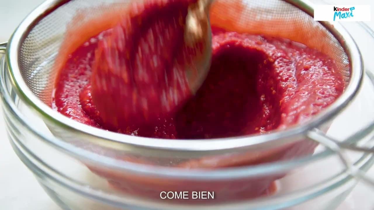 Para el puré de frambuesas, machacar las frambuesas en un recipiente alto, pasarlas por un colador y mezclarlas con el azúcar glass en un tazón.