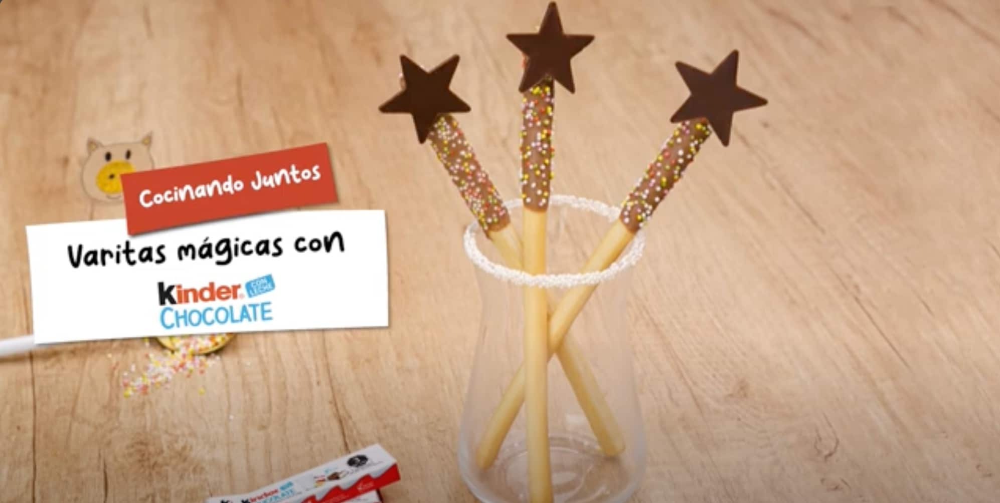 Varitas Mágicas con Kinder® Chocolate Varitas Mágicas con Kinder® ChocolateMe gusta | 0Ya te gusta ;)20 minutos10 minutoskinder_chocolate_receta_varitas_magicas.pdf Ingredientes: 6 barras de Kinder® Chocolate (75 g)8 a 10 palitos horneados crujientes60 g de azúcar en polvo de colores8 a 10 estrellas grandes de chocolateInformación nutricional: Porciones: 10Por porción: 18 gPor porción: 118 kcal Instrucciones: removed Derrite Kinder® Chocolate al baño maría. Vierte en un vaso. Sumerge el primer tercio de los palitos crujientes en el Kinder® Chocolate derretido. Espolvorea con el azúcar granulado hasta que el palito quede cubierto por todos lados. Coloca las barritas en la nevera durante 10 minutos hasta que el chocolate esté seco. Coloque estrellas de chocolate en el extremo de las varitas mágicas con una cucharada de Kinder® Chocolate aún caliente. Puedes ver nuestro tutorial completo aquí: Varitas mágicas Compartir receta Receta anteriorVolver a recetasReceta siguiente