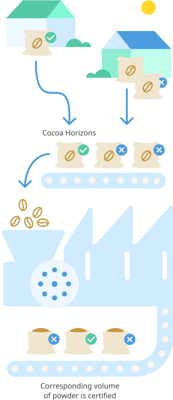 En el caso de productos de chocolate procesados externamente, nuestros proveedores pueden mezclar cacao certificado con no certificado. Sin embargo, garantizan que el volumen que nos entregan equivale, como mínimo, a la misma cantidad de cacao certificado.