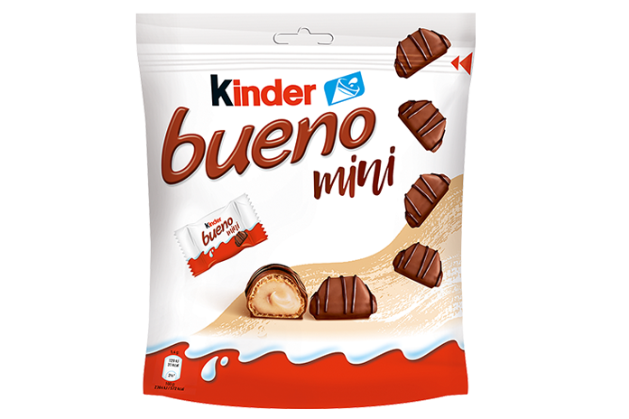 Kinder Bueno Mini: mini vafelj z mlečnim in lešnikovim polnilom, oblit z mlečno čokolado.