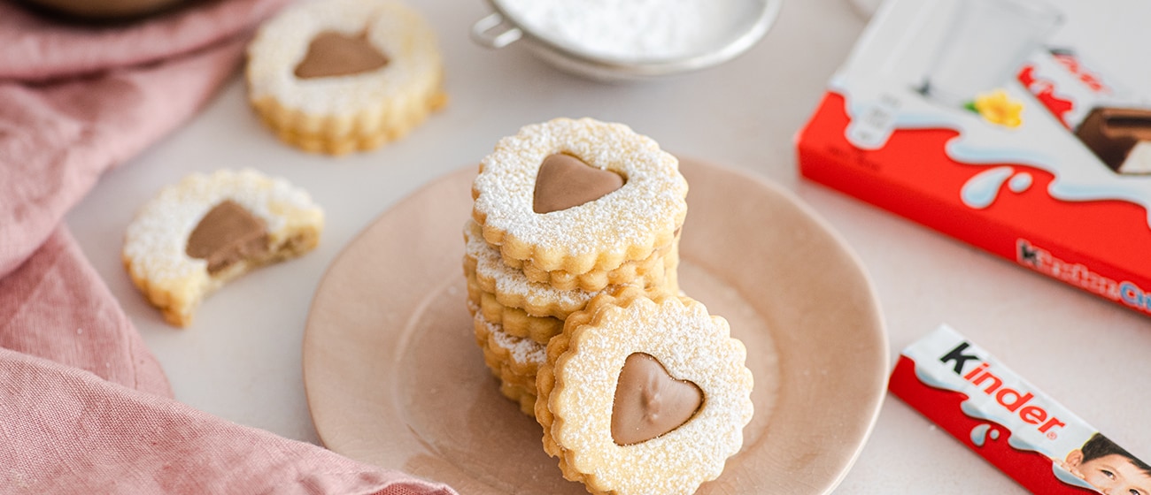 Stopimo palčke Kinder Chocolate®. Piškote brez srca premažemo s Kinder Chocolate® in povežemo del brez in s srcem. Po združitvi položimo preostanek Kinder Chocolate v sredino srca. Piškote ohladimo še približno 30 minut in postrežemo ali pa shranimo v posodi za piškote.