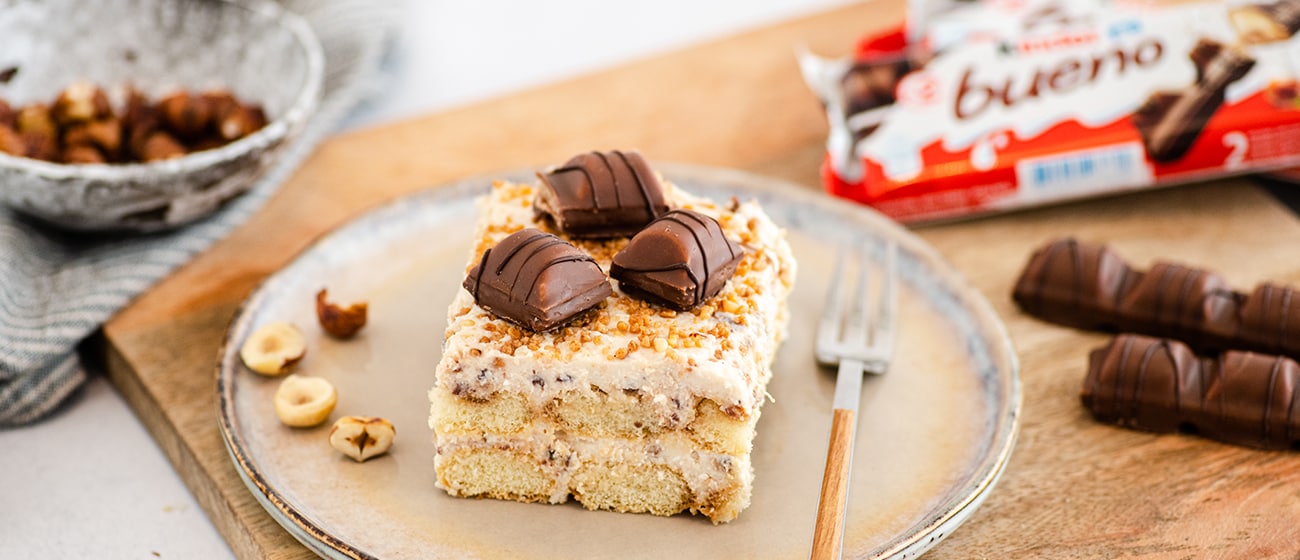 Pred serviranjem tiramisu potresemo z lešniki in okrasimo s preostankom Kinder Buena®.